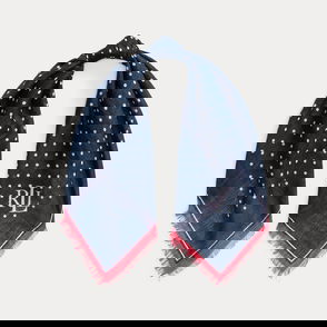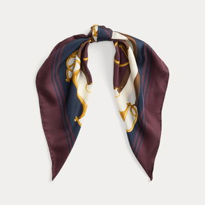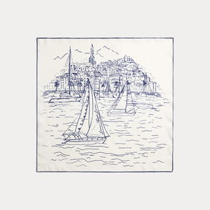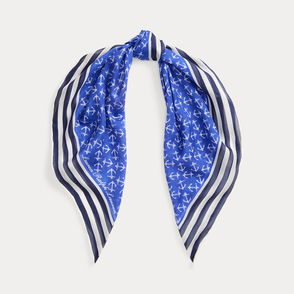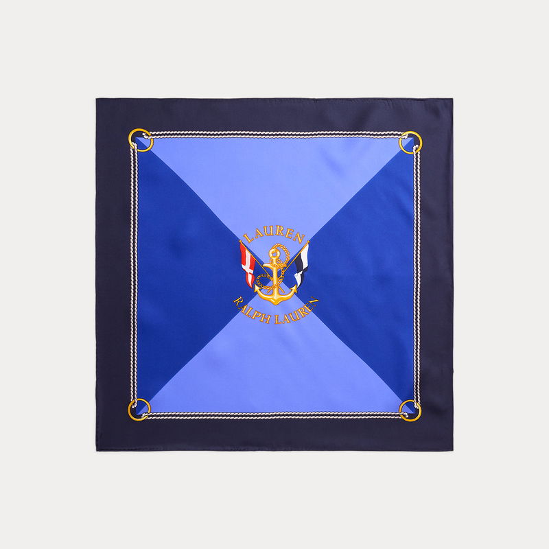 Crafted from smooth silk, this square scarf features nautical-inspired motifs—including an anchor-and-flag crest and a rope-print border—against a tonal, colour-blocked backdrop.