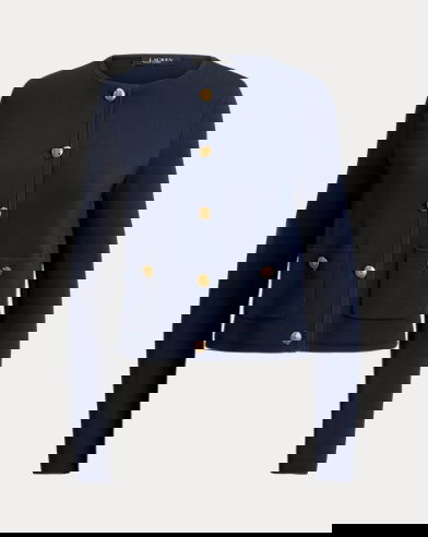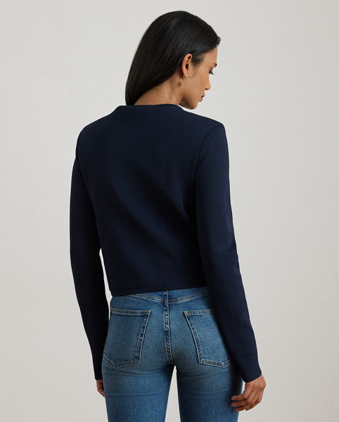 This elegant jumper jacket features a cropped silhouette embellished with signature crest-embossed buttons.