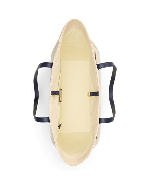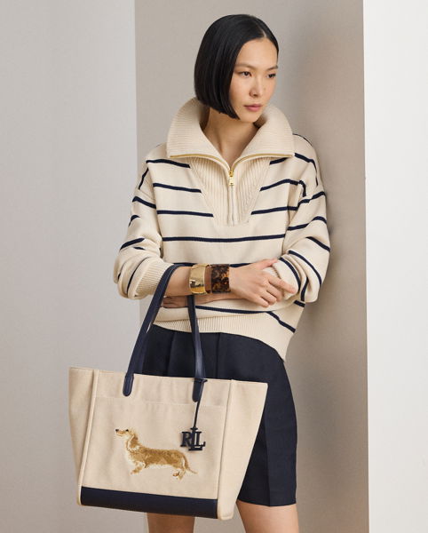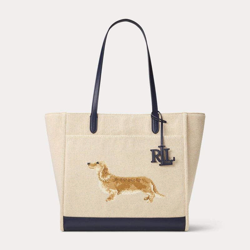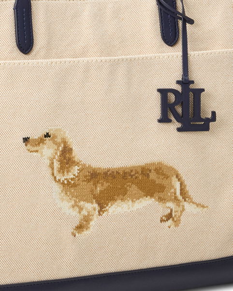 Trimmed with supple full-grain leather, this version of the large Cameryn tote bag features a spacious canvas silhouette embroidered with an adorable dog at the front.