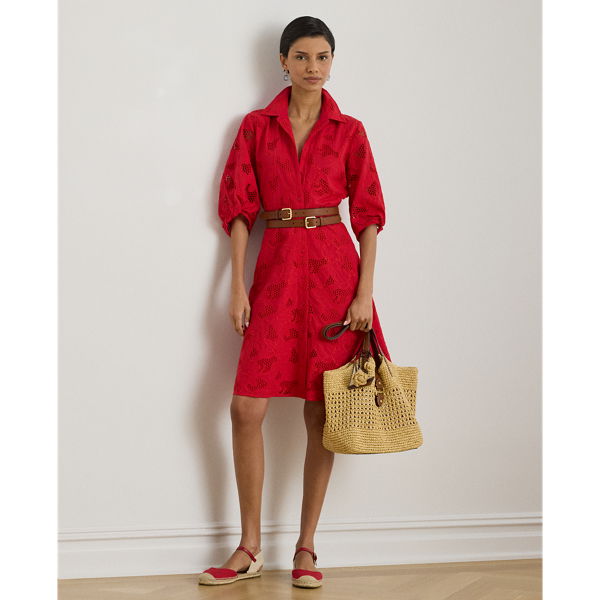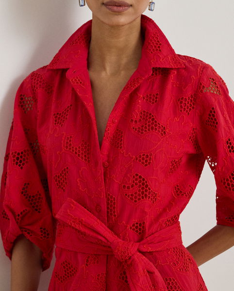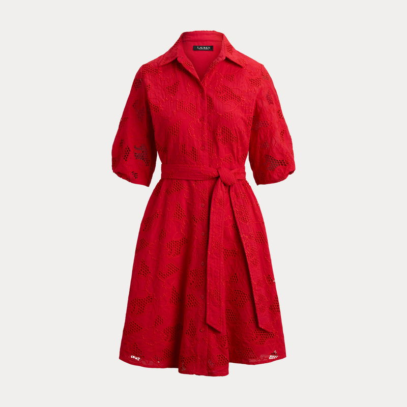 Crafted from airy cotton voile, this feminine shirtdress features all-over floral eyelet embroidery, voluminous balloon sleeves and a belted waist.