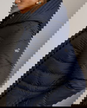 Distinguished by a faux fur-trimmed hood, a channel-quilted construction and a knee-grazing length, this funnelneck coat is equipped with a water-resistant shell and 450-fill-power down to keep you dry and warm. Lauren’s signature faux leather logo patch completes the look.