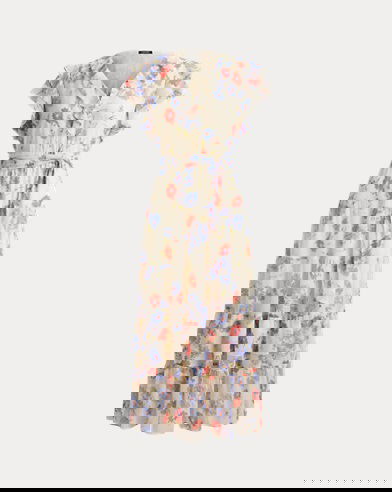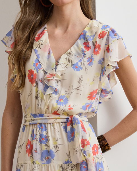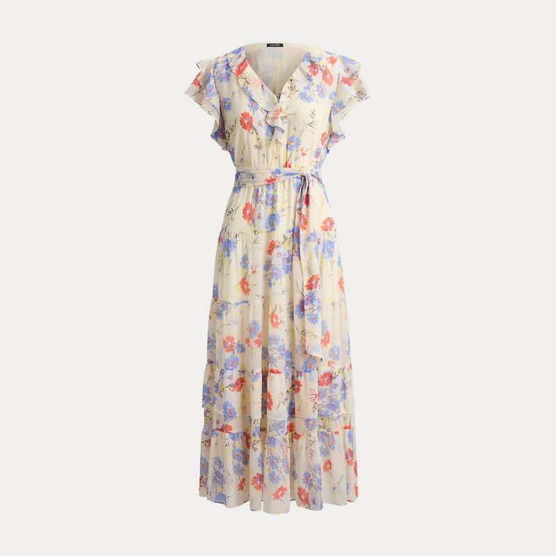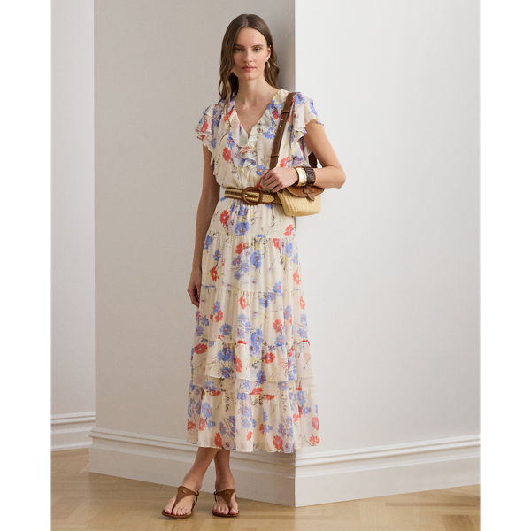 The season’s painterly floral motif and ruffle trim enhance the romantic allure of this midi dress, which combines a tiered skirt with crinkle georgette for graceful movement with each step. A belted waist completes the look.