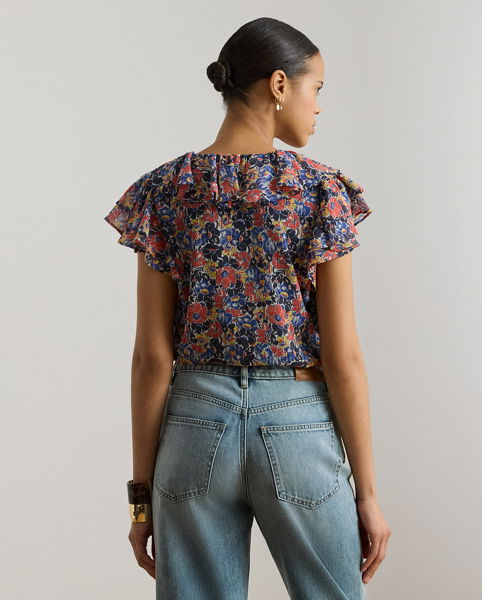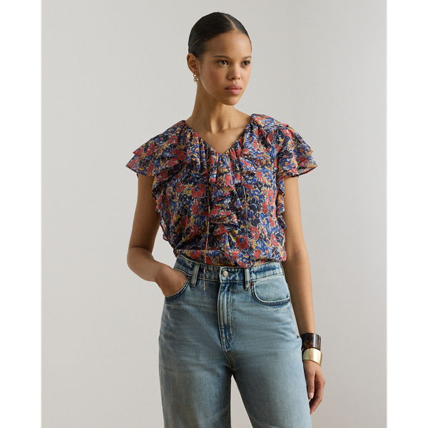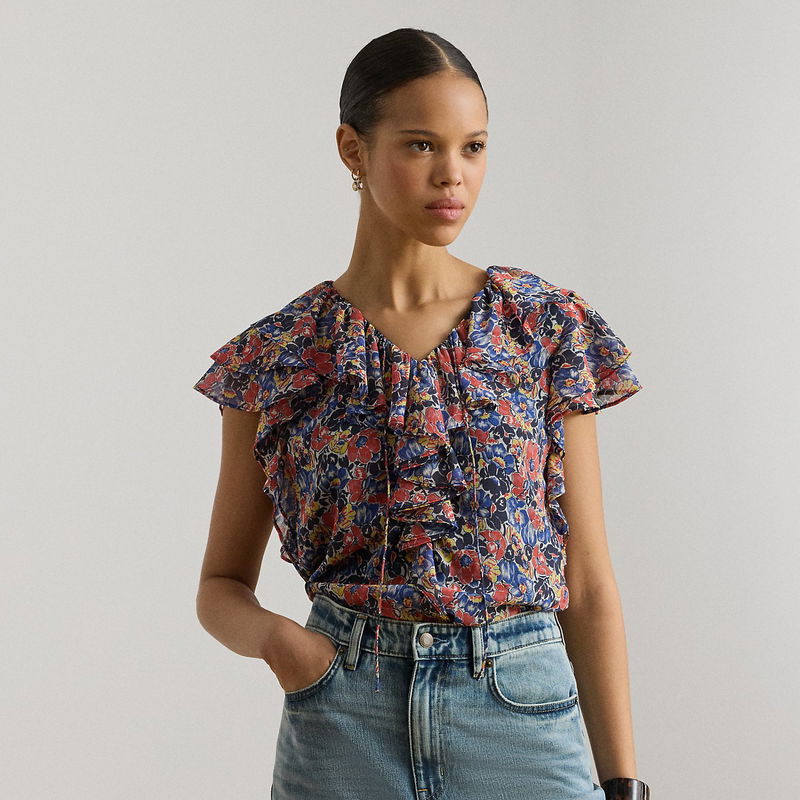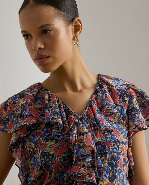 Cascading ruffles, flutter sleeves and airy georgette define the feminine character of this tie-neck blouse, which features the season’s floral print in a lively colour palette of red, blue and cream with yellow accents.