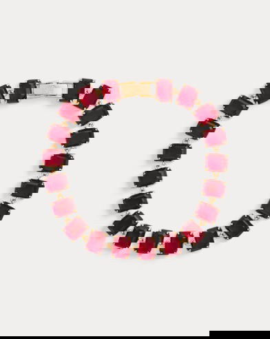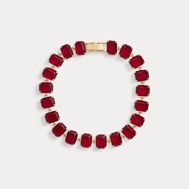 This 14K gold-plated bracelet reimagines the classic tennis style with a stunning array of emerald-cut imitation gemstones. An “LRL” logo on the clasp adds a subtle signature finish.