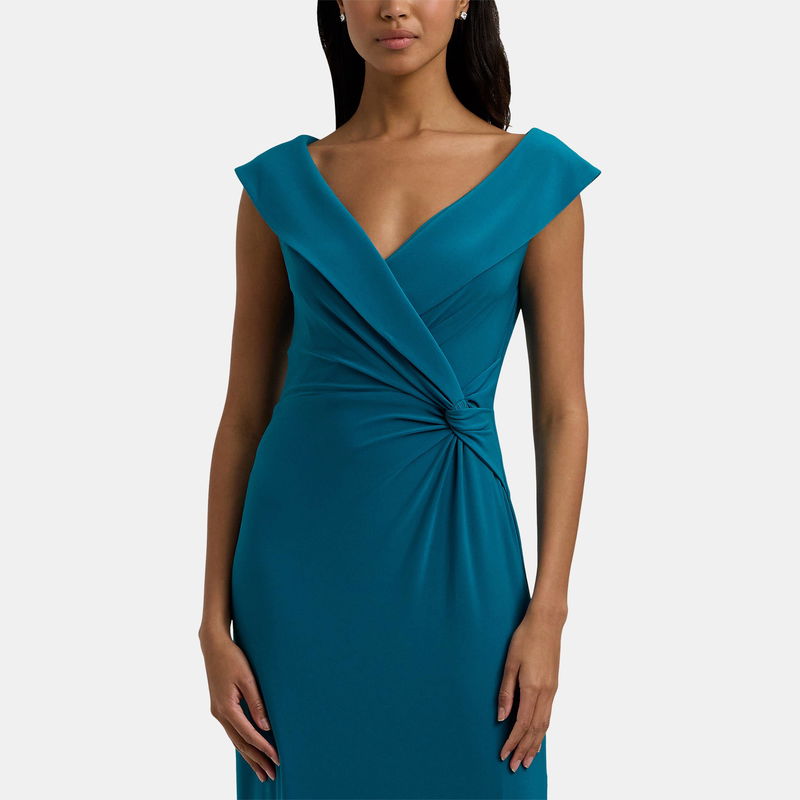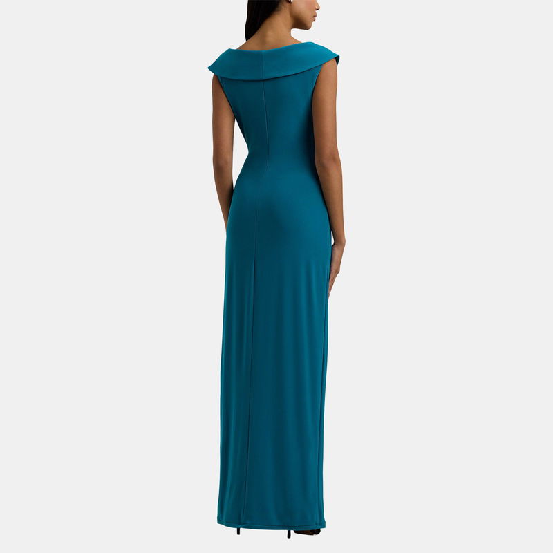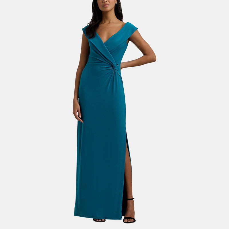 Step into a world of elegance and timeless glamour with Lauren by Ralph Lauren Leonidas Gown. Crafted from a blend of luxurious polyester and elastane, this gown envelops you in a body-hugging jersey fabric. Featuring a flattering off-the-shoulder silhouette with a fold-over collar, exuding an air of sophistication. With its full length and twist detail at the waist, this maxi dress creates a figure-flattering effect that accentuates your curves. The slit down the left skirt offers a hint of allure, capturing attention with every step you take, while the concealed right-side-seam zipper and a hook-and-eye closure ensure a seamless and secure fit. Designed in turquoise sky, a colour that radiates confidence and charm. Whether you are attending a gala or a formal soir e, the Leonidas Gown is the perfect refined piece to add to your occasion wear wardrobe.
