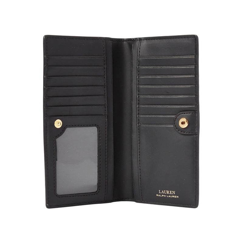 Distinguished by its textured leather finish and signature gold-tone hardware, this Lauren Ralph Lauren slim billfold wallet combines practicality with timeless style. The compact design features meticulous attention to detail, from the branded metal monogram to the precision stitching along its edges. Multiple card slots and a dedicated ID window make this wallet as functional as it is sophisticated.