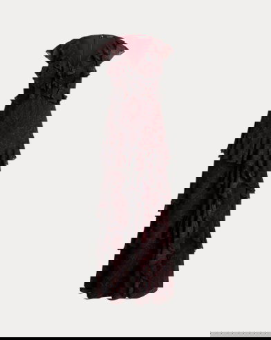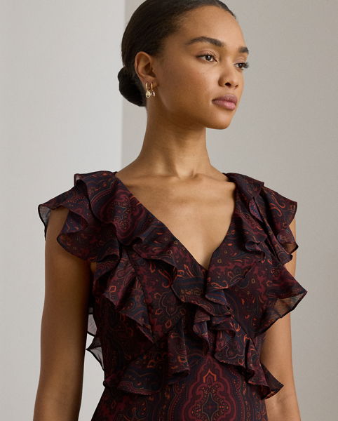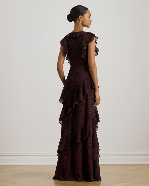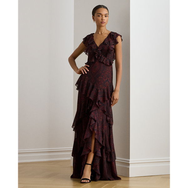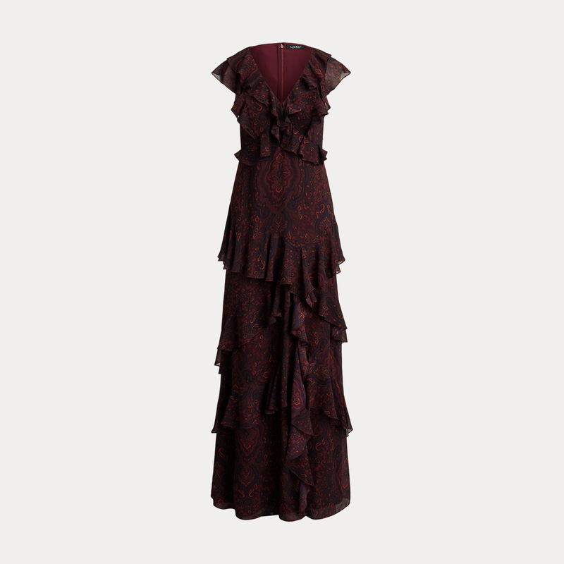A standout choice for your next event, this floor-length gown displays a paisley print in the season’s rich burgundy colour palette. This style’s crinkle georgette construction unites with cascading ruffles and a tiered skirt, creating effortless movement with each step.