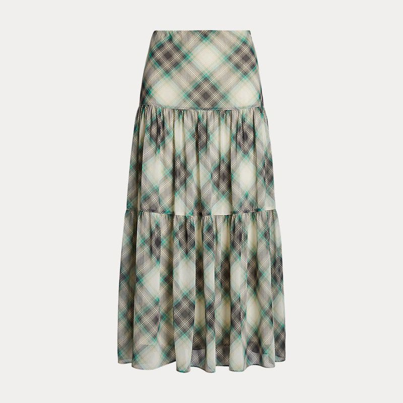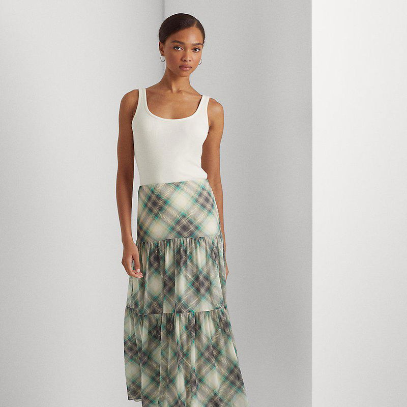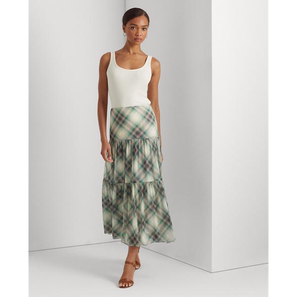 Airy crinkle georgette and a tiered silhouette lend graceful movement to this calf-grazing skirt, which is elevated by the season's sophisticated plaid print.