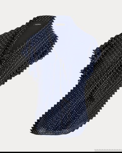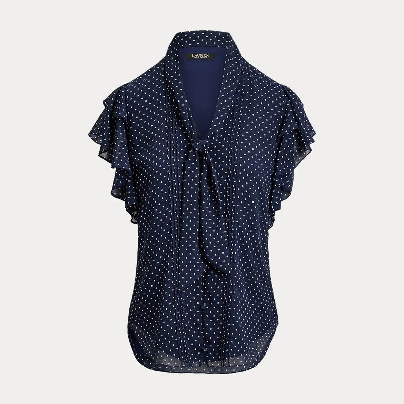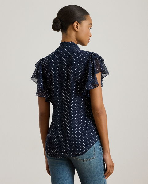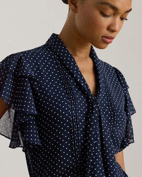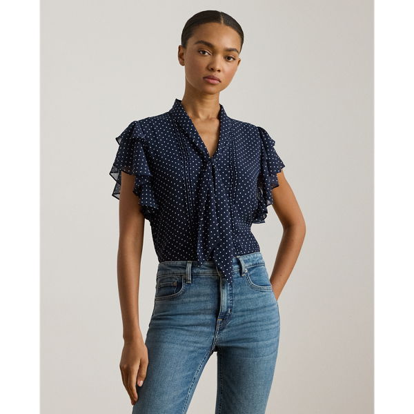 Polka-Dot Georgette Tie-Neck Blouse. Crafted from airy georgette, this tie-neck blouse features flutter sleeves and a classic polka-dot print.
