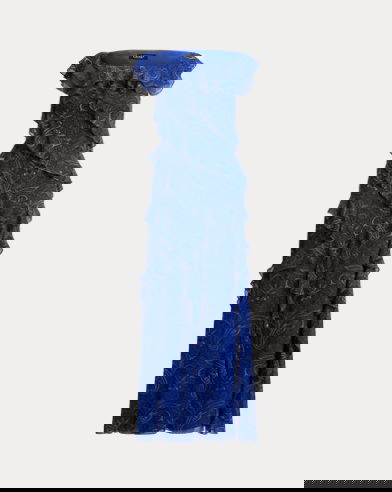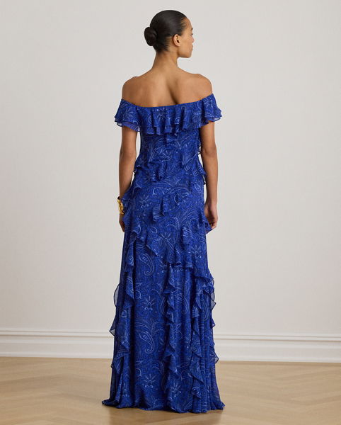 Cascading ruffles and crinkle georgette bring effortless movement to this stunning off-the-shoulder gown, which showcases the season’s tonal paisley motif.