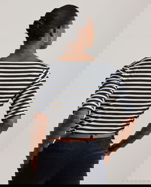 Made with breathable stretch cotton for a soft hand feel, this boatneck tee showcases a sailboat-inspired abstract motif. Lauren's signature embroidered logo on the hem completes the look.