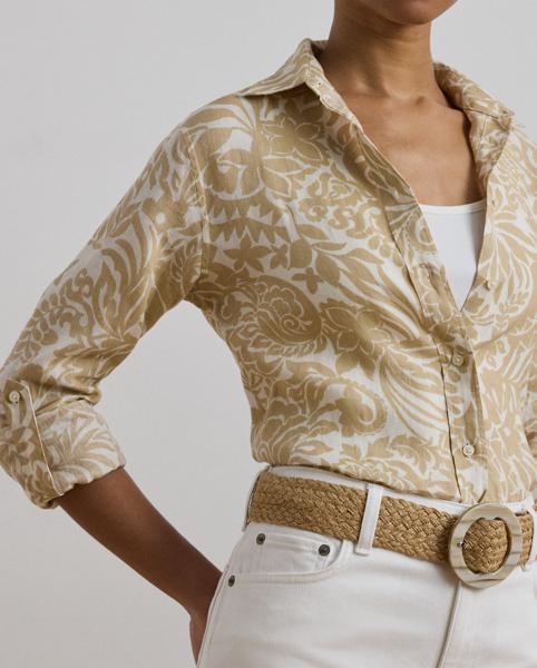 Roll-tab sleeves enhance the effortless character of this relaxed-fitting shirt, which is crafted from lightweight linen for an airy look and feel. This version is refreshed for the season with a two-tone, embroidery-inspired floral motif.