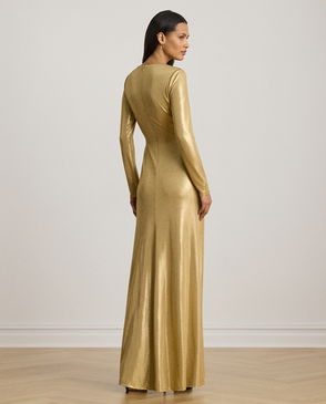 Rendered in smooth stretch jersey for ease of movement, this elegant cap-sleeve dress showcases a figure-skimming sheath silhouette and a pleated wrap-style overlay that gathers into a bamboo-inspired, textured metal O-ring at the waist.