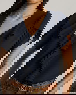 Lauren Ralph Lauren Lauren puts a unique twist on the button-up collared shirt with a soft slub jersey construction, a sleeveless silhouette and feminine ruffles at the shoulder seams. A tonal "LRL"-embroidered logo at the hem and "LRL"-engraved imitation pearl buttons add iconic style.