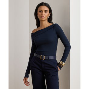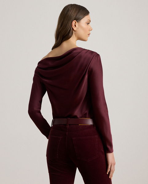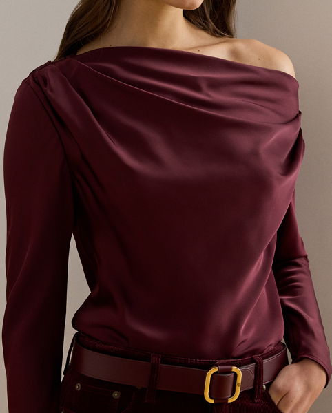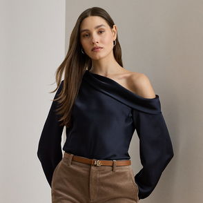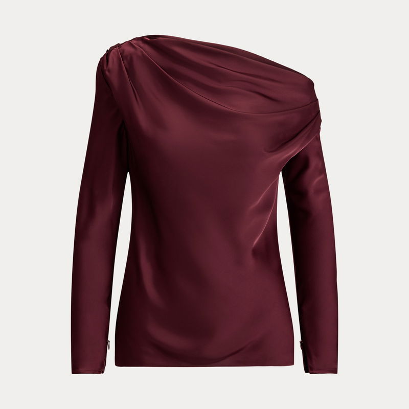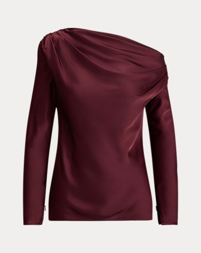 Delicate pleats accentuate the graceful off-the-shoulder silhouette of this long-sleeve blouse, which is crafted from satin charmeuse for a lustrous finish.