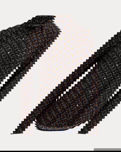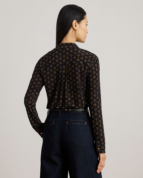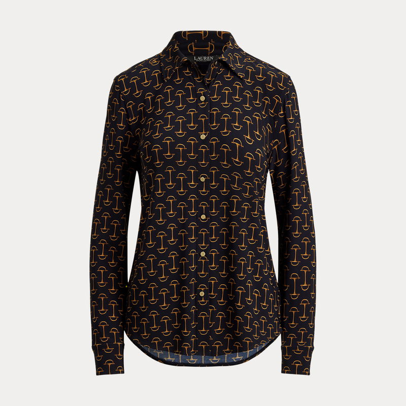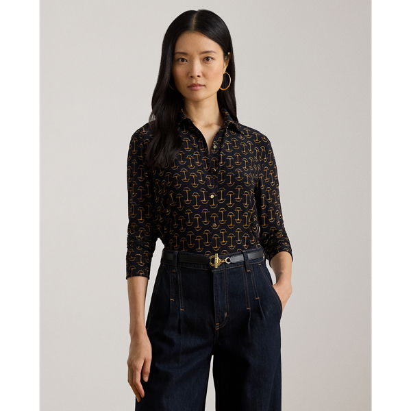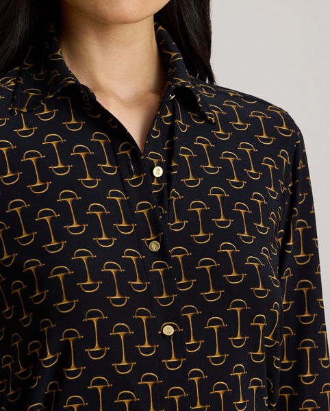 Crafted from soft stretch jersey, this button-down shirt showcases the season’s equestrian-inspired geometric print.
