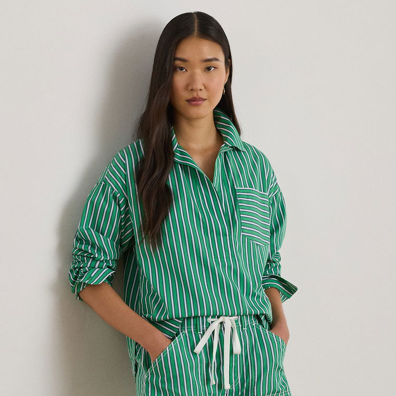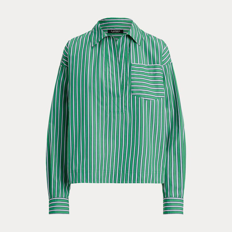 Tailored with crisp cotton broadcloth, this essential collared shirt features yarn-dyed stripes and a cropped, slightly boxy silhouette.