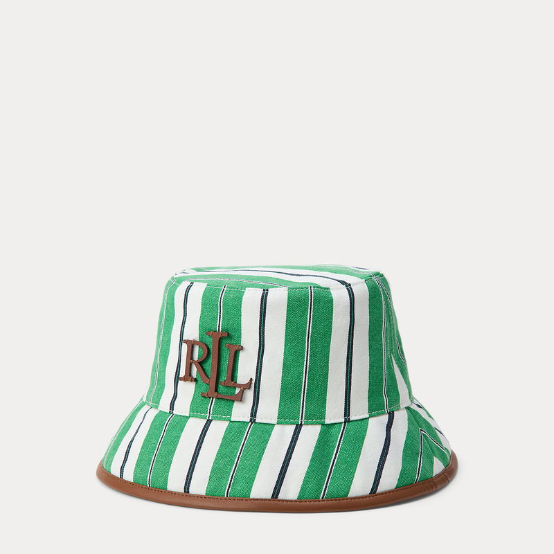 Striped Leather-Trim Canvas Bucket Hat
