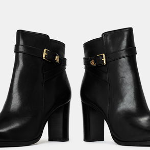 Crafted with luxuriously smooth calfskin leather, the Tasha bootie pays homage to Ralph Lauren Lauren's equestrian-inspired heritage with a stacked leather heel, a D-ring ankle strap and "LRL"-engraved stud hardware.