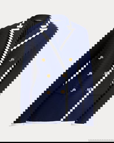Tailored with stretch-cotton blend piqué, this double-breasted blazer showcases a two-tone design, peak lapels and signature buttons.