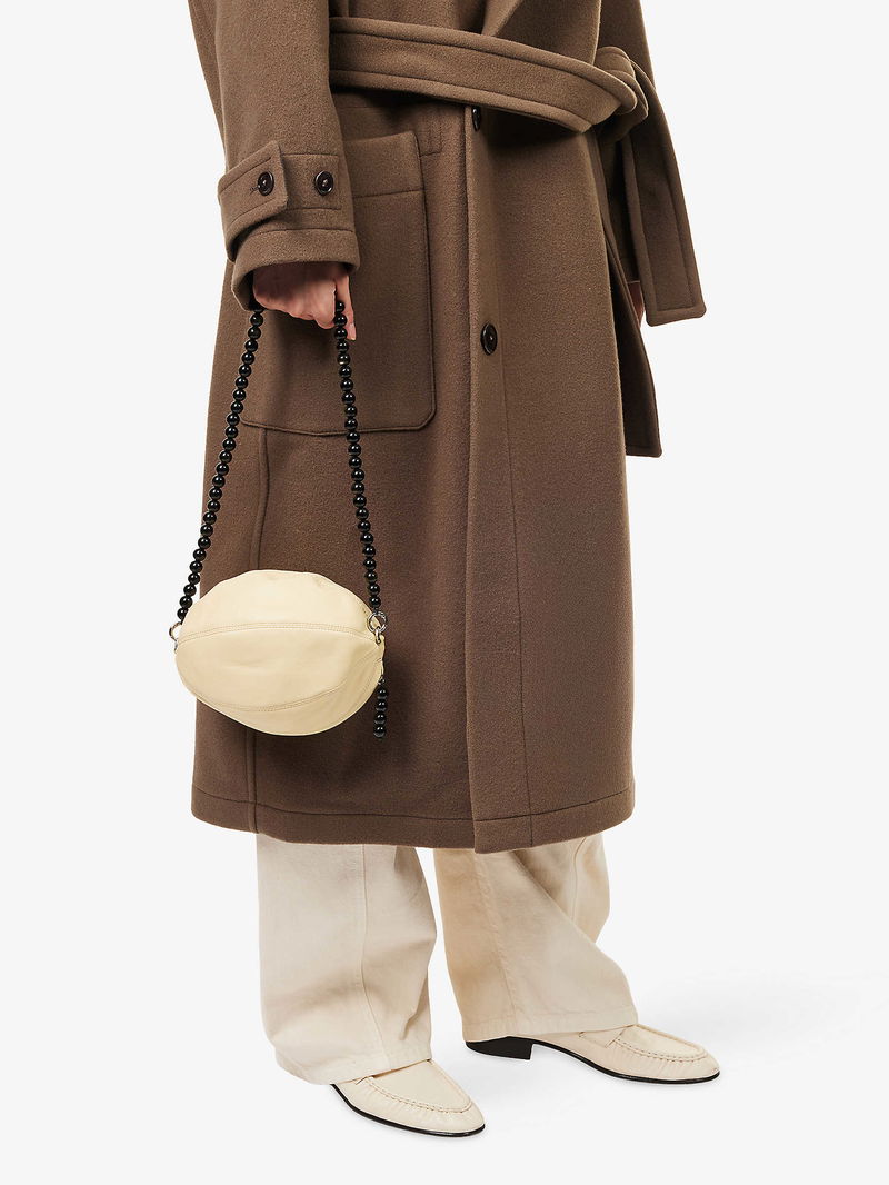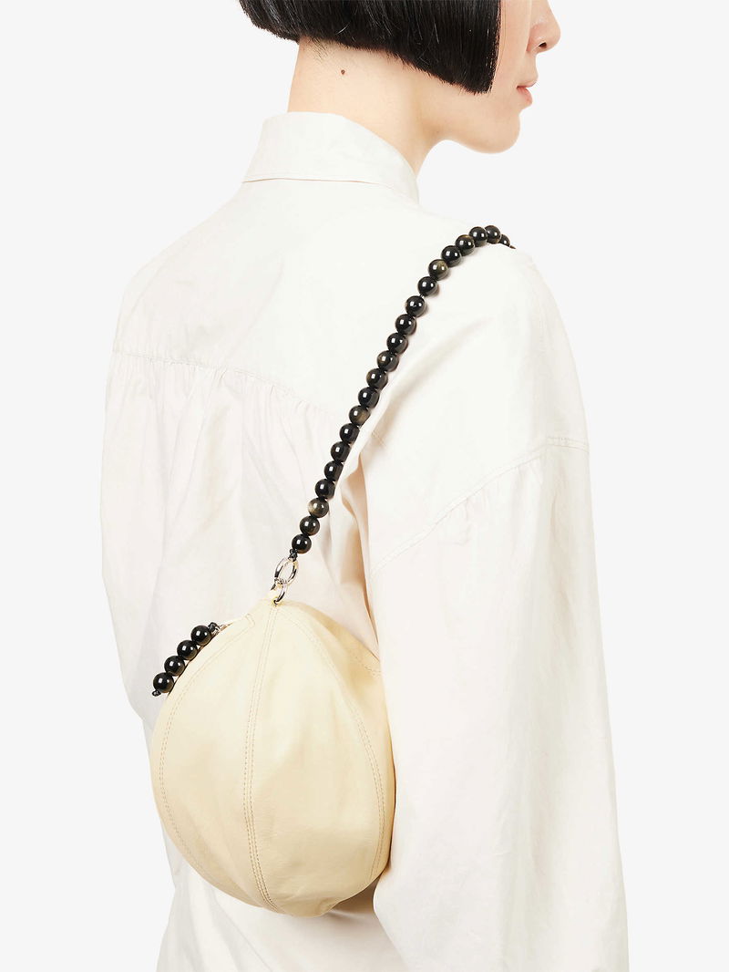 LEMAIRE leather pouch. Balloon shape, detachable beaded strap, all-over panels, all-over grained leather, silver-toned hardware, one main compartment, fully lined.