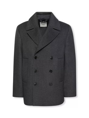 Boxy-fit yarn-dyed wool melton peacoat. · Notched lapel· Double-breasted button closure· Patch pocket at chest· Seam pockets· Dropped shoulders· Adjustable button tabs at back hem· Corozo hardware.