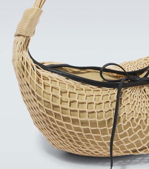 Crinkled leather messenger bag in beige. · Knotted detailing at fixed shoulder strap· Zip pocket at side· Padded pull-tab at zip closure· Patch pocket and zip pocket at interior· Cotton twill lining.