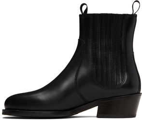 Mid-calf vegetable-tanned polished leather Chelsea boots in brown. · Pull-loops at collar· Concealed elasticized gusset at sides· Buffed leather lining · Stacked leather midsole· Stacked leather block heel with rubber injection· Leather sole.