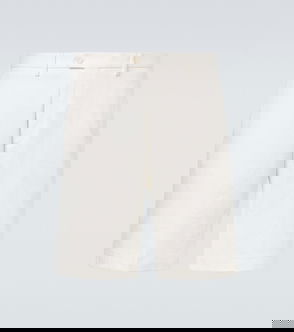 Cotton twill shorts. Belt loops. Adjustable cinch tabs at waistband. Four-pocket styling. Zip fly. Pleats at front. Partial twill lining.