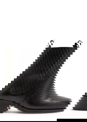 Ankle-high paneled buffed and grained leather boots in black.· Pull-loops at collar· Calfskin lining· Stacked leather heel with rubber injection· Suede sole with rubber injection.
