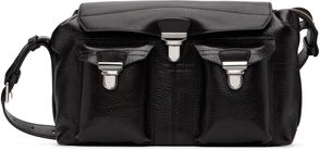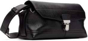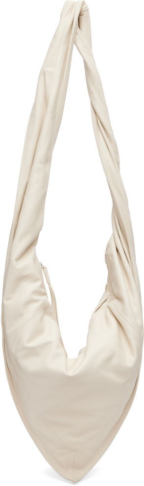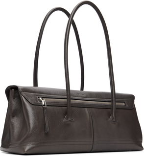 LEMAIRE leather shoulder bag. Curved shape, carabiner at adjustable strap, zip pocket at side, all-over grained leather, silver-toned hardware, one main compartment.