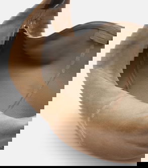 • Curved shape, clip-fastening at smooth leather strap, zip pocket at front, all-over suede leather, silver-toned hardware, one main compartment, fully lined