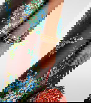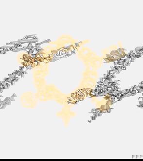 Open cuff bracelet in gold-tone and silver-tone brass. Charms at length. Part of the Rattle collection.