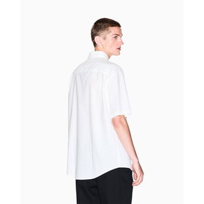 Cotton poplin henley. Crewneck. Single-button placket. Shirttail hem. Welt pocket at chest. Dropped shoulders. Box pleat at back yoke.