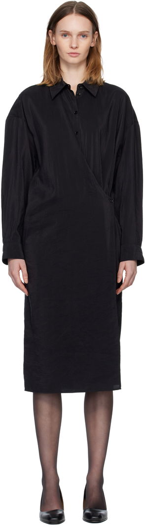 Cotton poplin dress. · Wrap construction· Spread collar· Offset button closure· Self-tie straps and twisted detailing at waist · Single-button barrel cuffs· Gathering at back yoke.