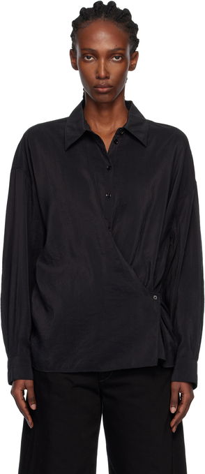 Cotton poplin shirt. · Wrap construction· Spread collar· Offset button closure· Self-tie straps and twisted detailing at waist · Single-button barrel cuffs· Gathering at back yoke.