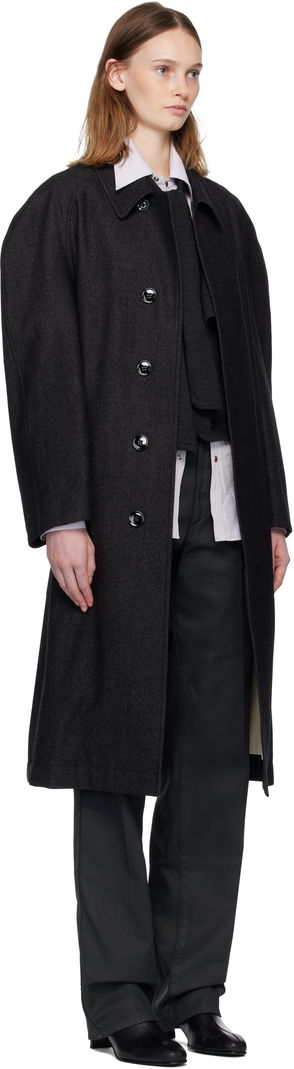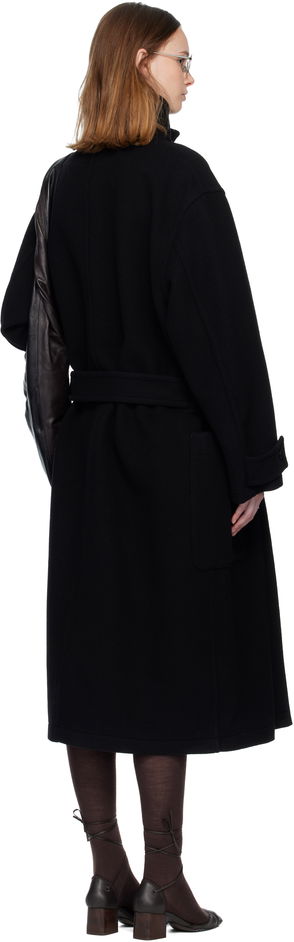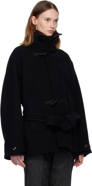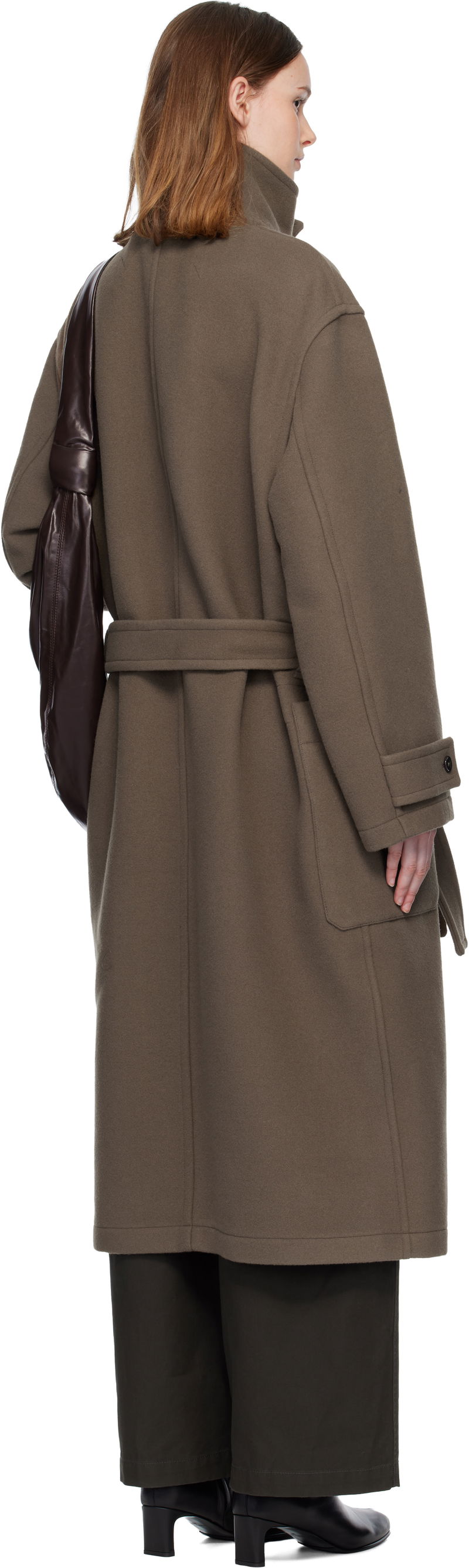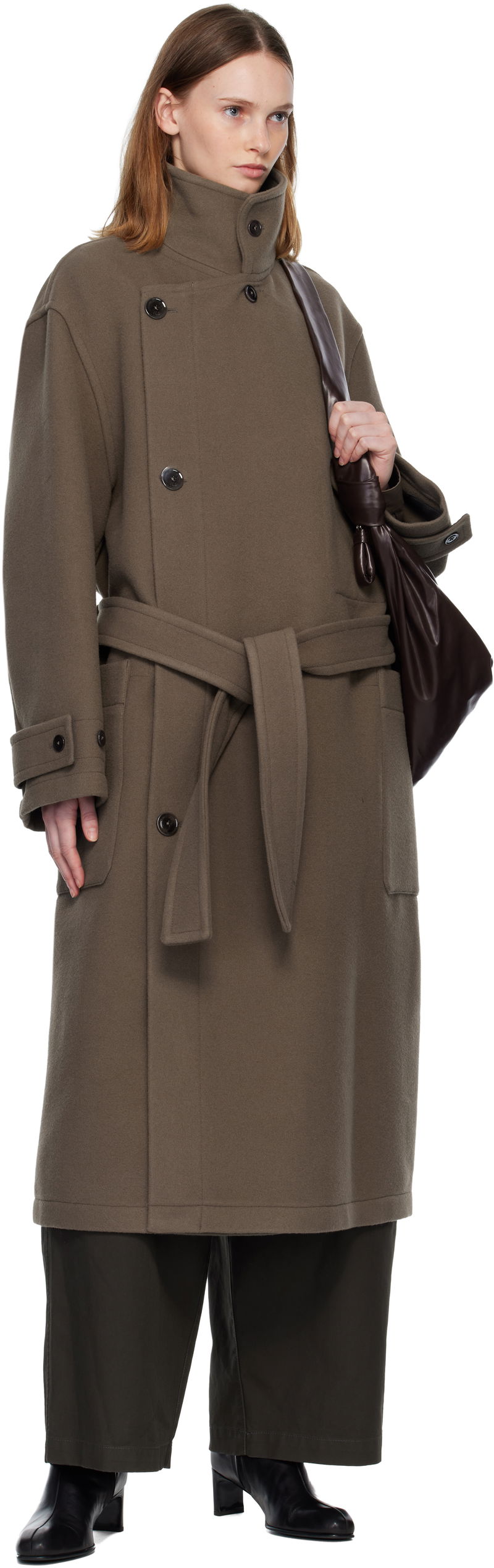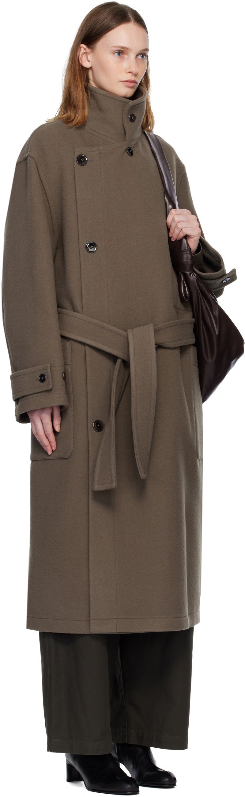 Double-faced wool melton coat. Wrap construction. Button fastening at stand collar. Offset button closure. Patch pocket at front. Belt loops at waist. Detachable self-tie belt. Adjustable button tab at cuffs. Patch pocket at interior.