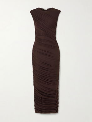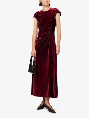 Knit wool-blend maxi dress. · Rib-knit boatneck, hem, and cuffs· Integrated self-tie belt· Vented side seams· Dropped shoulders.