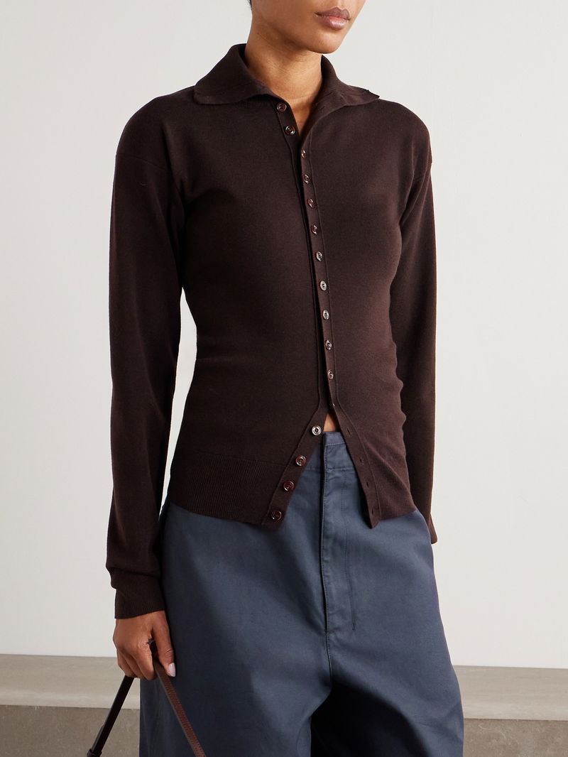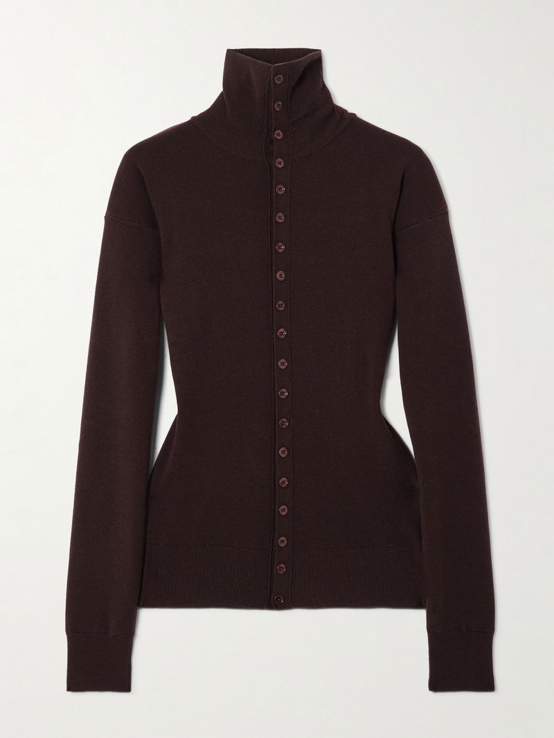 Lemaire opts for simplicity, emphasizing shape and proportion in their designs. This cardigan is knitted for a close fit from certified wool in a rich 'Aubergine' shade and has a high funnel neckline.