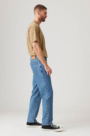 Regular, tapered fit Regular rise Belt loops Concealed fly Five pockets.