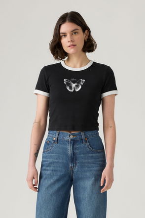 Can something be both instantly iconic and super playful? We think so. Case in point, our Graphic Mini Ringer T-Shirt. This cute crewneck pairs a cropped fit with bold Levi's® branding, thus striking that elusive balance between classic and prep. A tiny top with maximum Levi's® style Made with a cropped fit Short sleeves with contrast ribbing Finished with our iconic batwing logo Composition: 100% Cotton