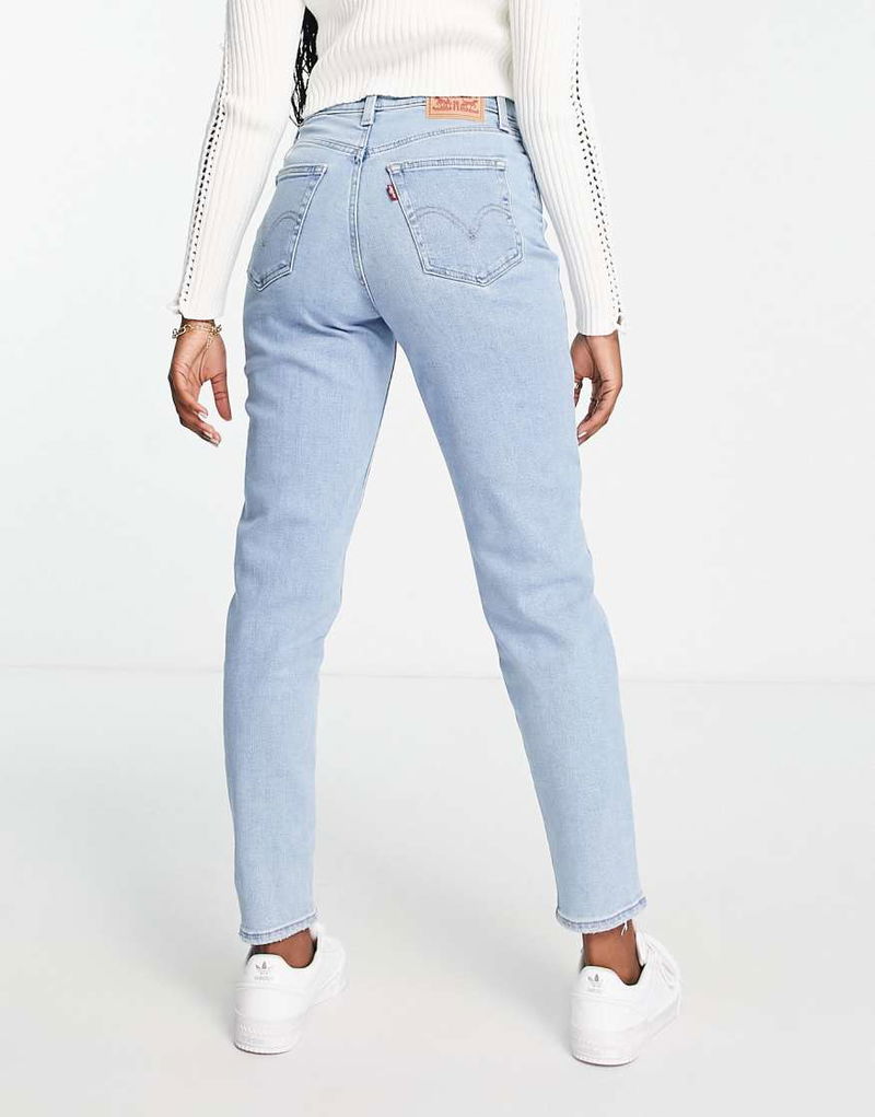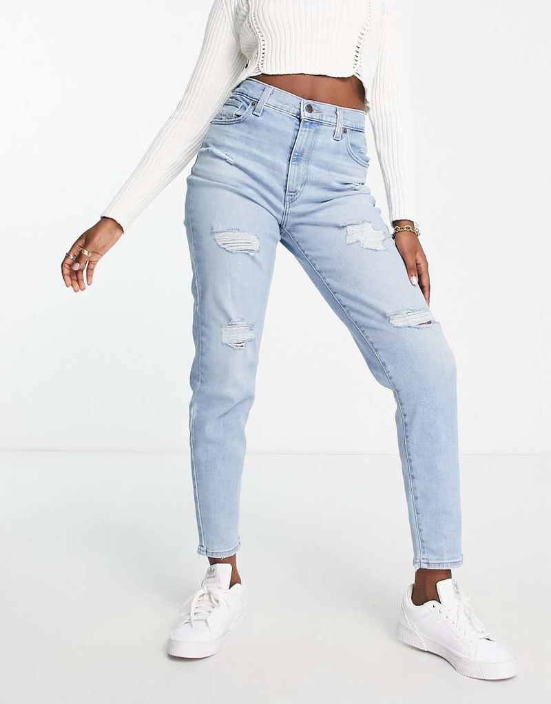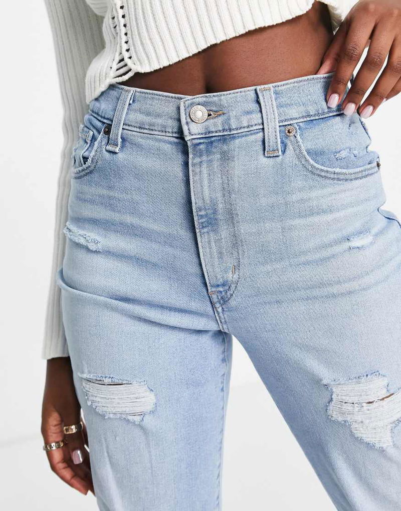 High Waisted Mom Jeans With Distressing In Light Wash Blue