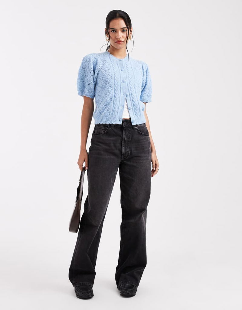 Pointelle Knitted Short Sleeve Cardigan In Baby Blue