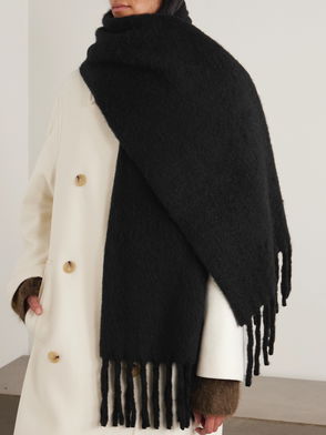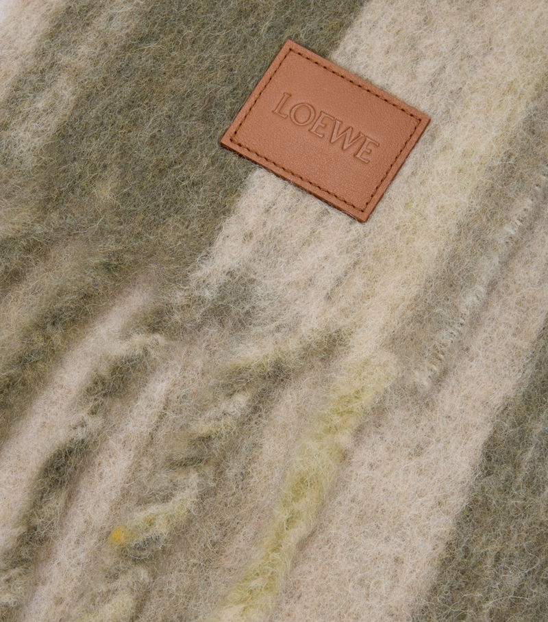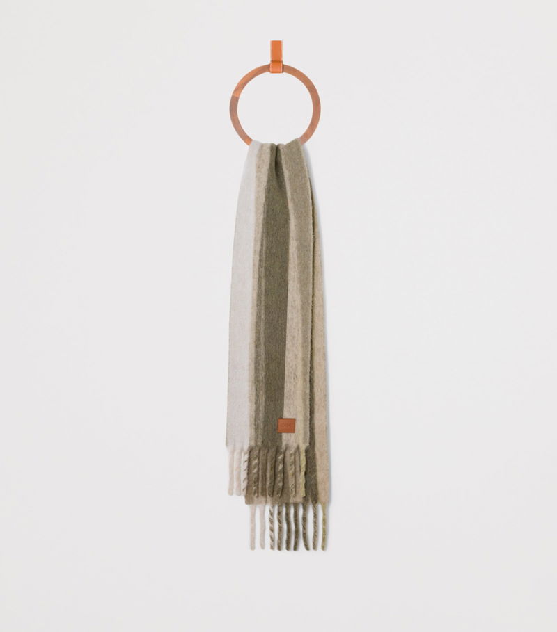 Loewe is renowned for its use of colour, bringing playful, bold hues to a suite of accessories and clothing. Here, the brand taps Italian craftsmanship for a soft, brushed alpaca-wool-blend scarf, which features a suite of neutral stripes that match perfectly with its iconic outerwear for a cohesive winter ensemble.