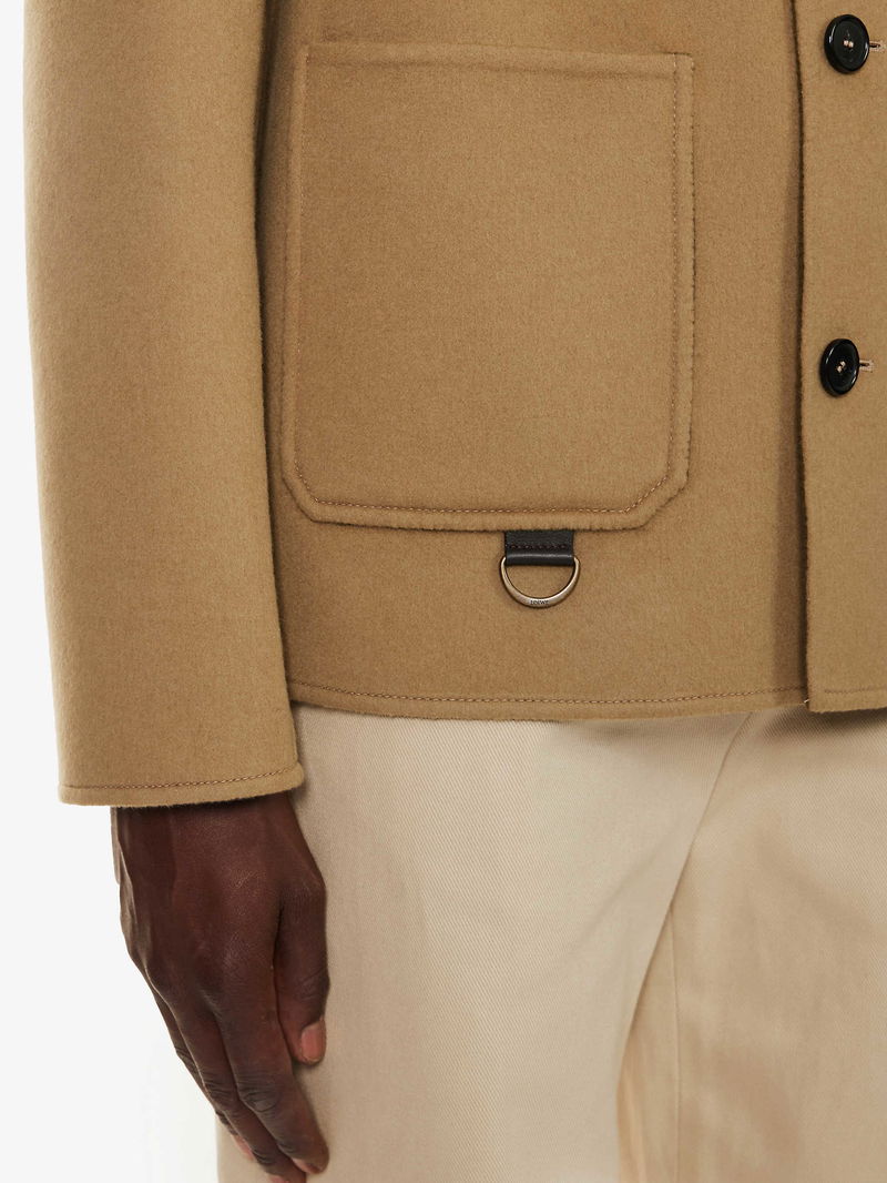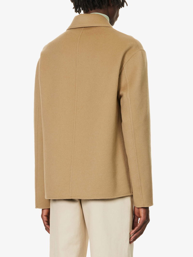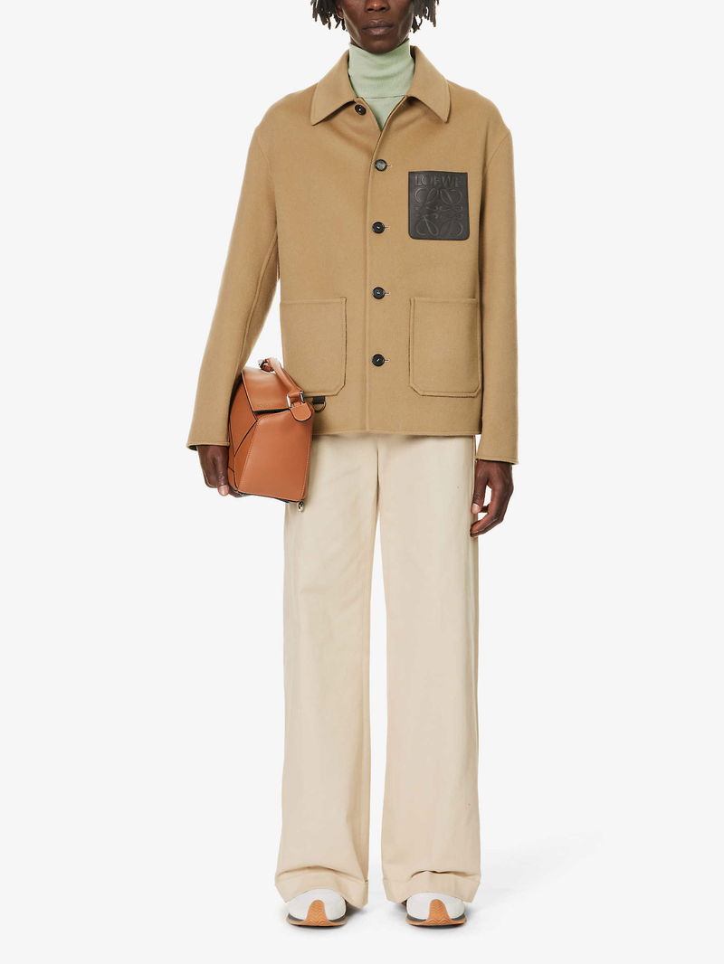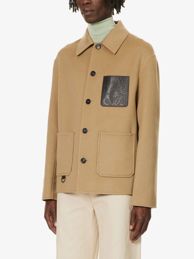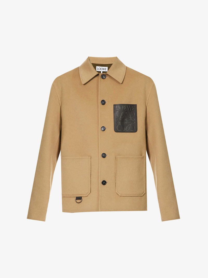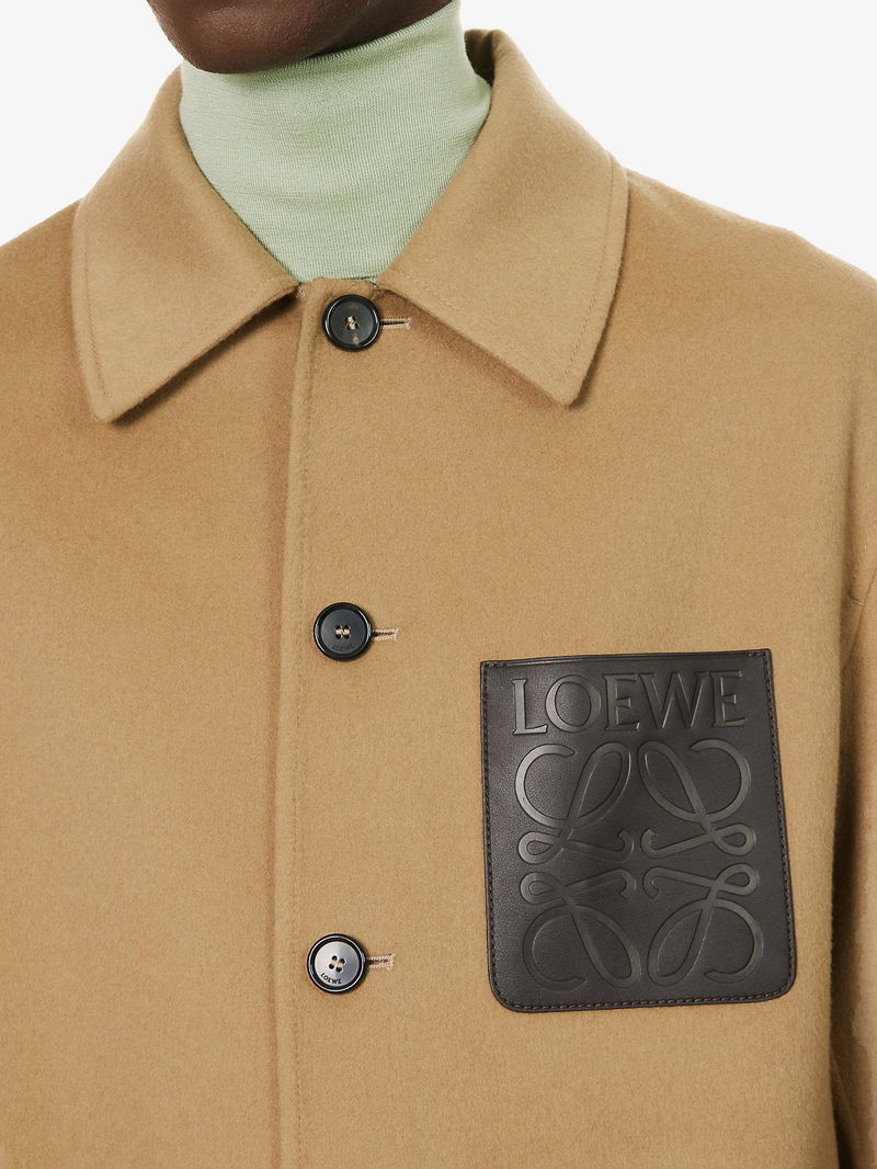 Loewe wool and cashmere-blend jacket. Exposed button fastenings at front Boxy fit. spread collar. long sleeves. branded patch pocket at chest. two patch pockets at front. soft-brushed texture. Lined.