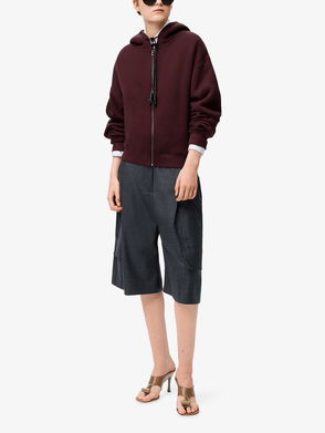 In 1970, Vincent Vela looked to the folded metal of branding irons used to mark leather for the inspiration for loewe's new logo. What the artist perhaps didn't expect, though, is the longevity of his creation; sitting atop designs like this cropped zip-up hoodie, the cursive Anagram has gone down in House history as one to behold.