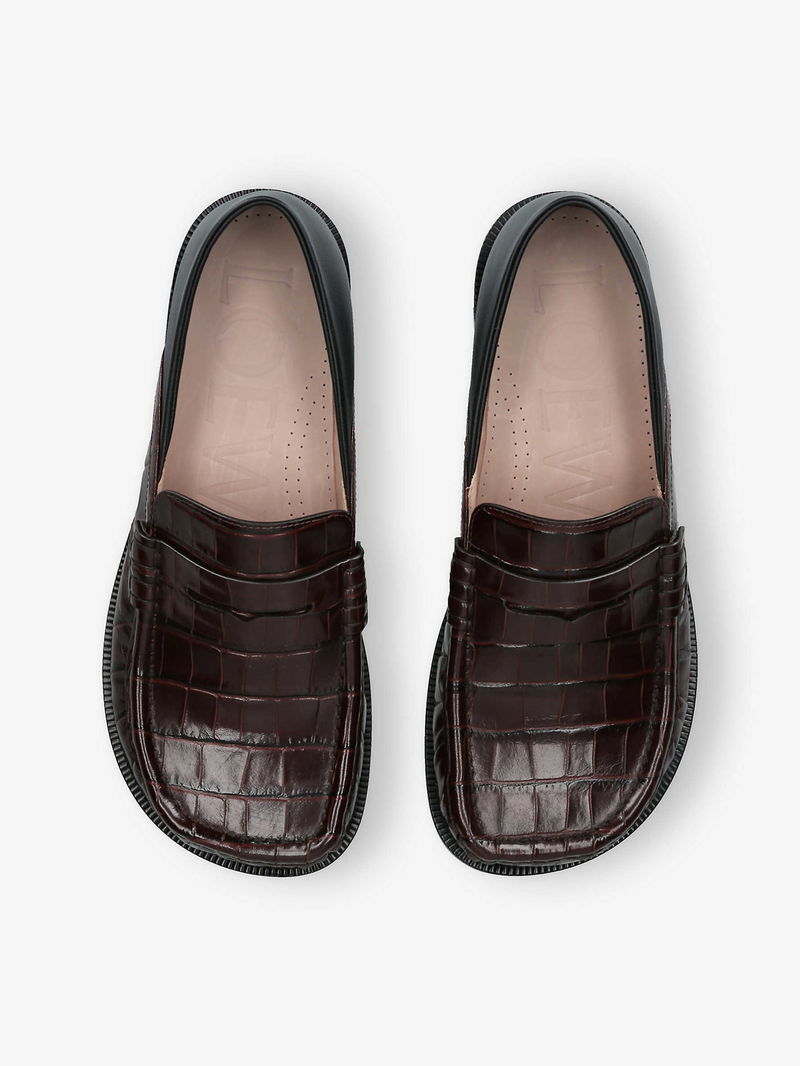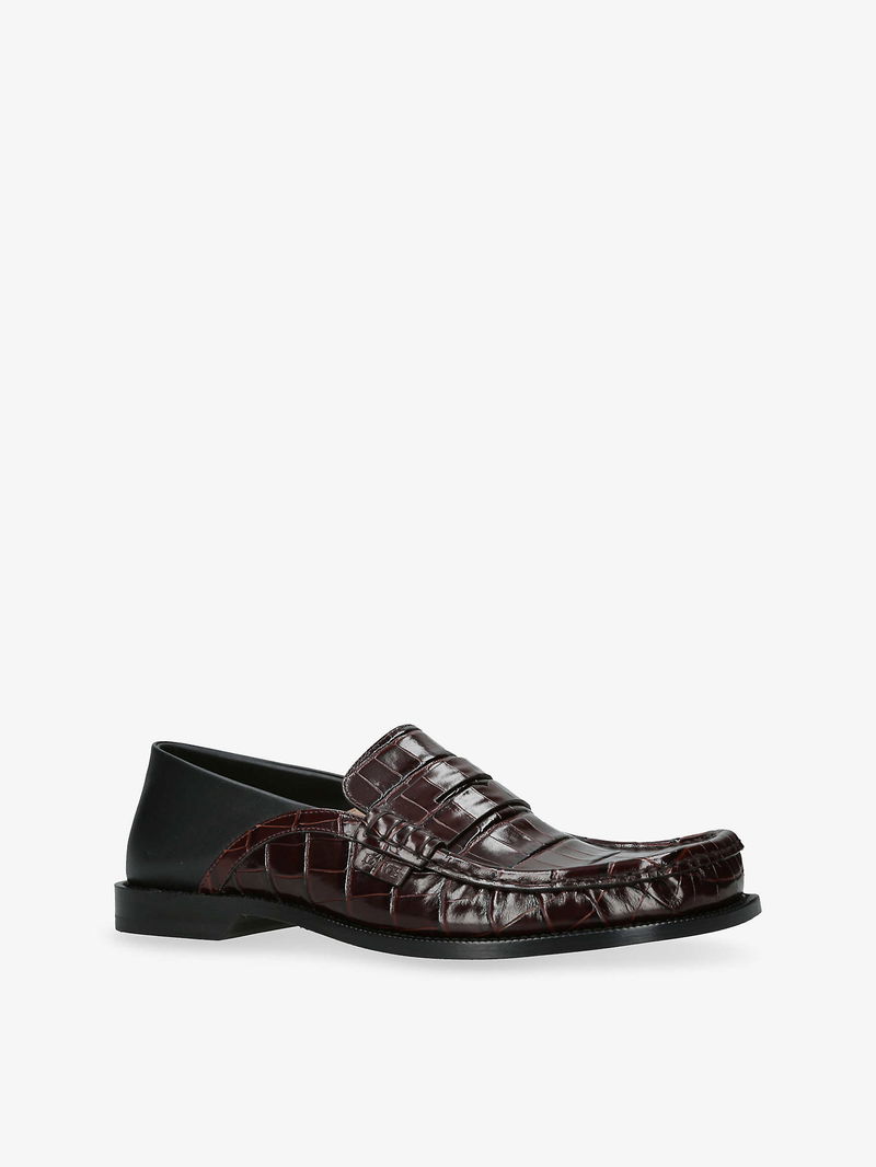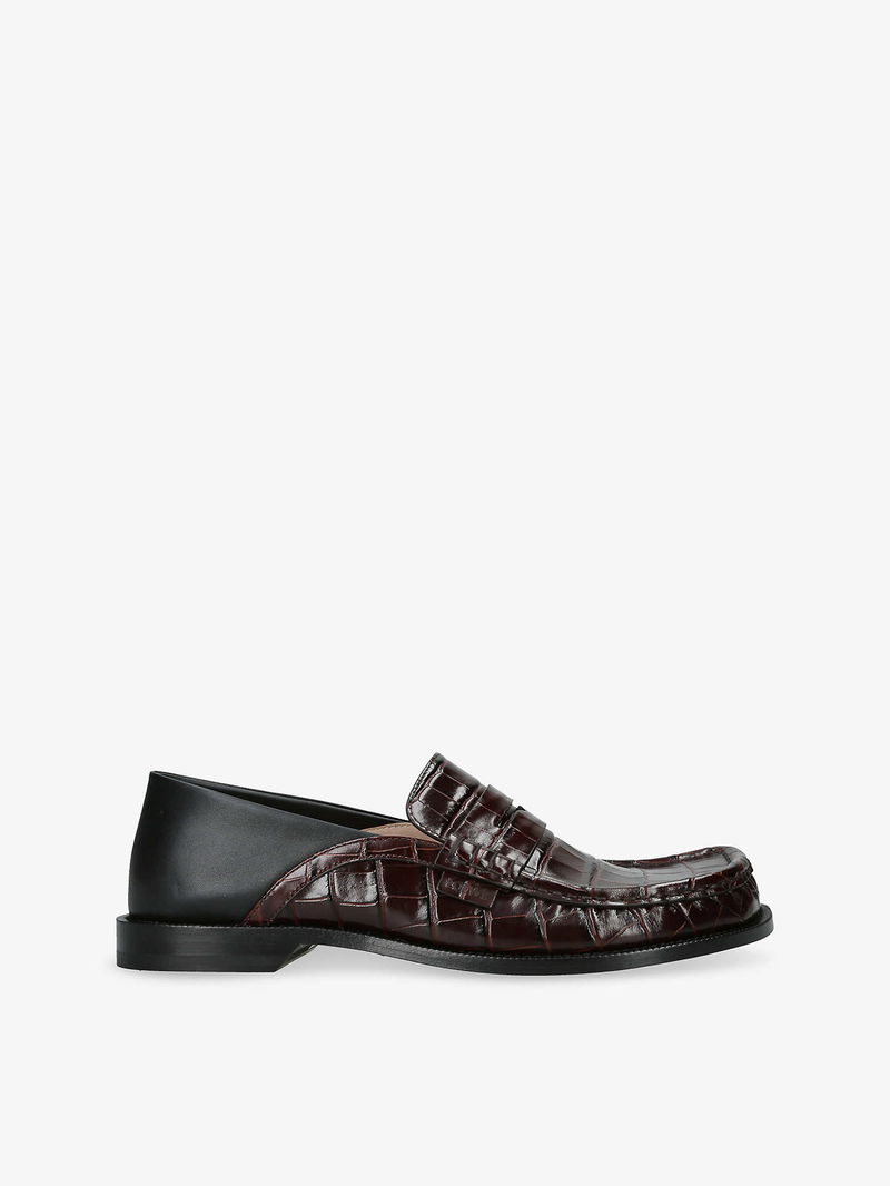 Loewe leather loafers. Asymmetric toe shape, collapsible back, croc-effect embossed texture, padded insole.