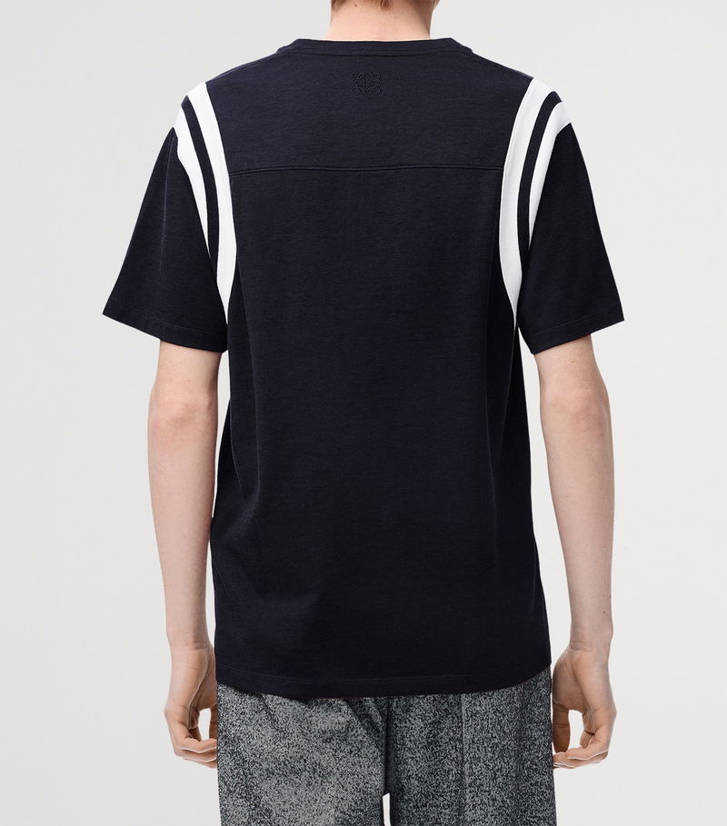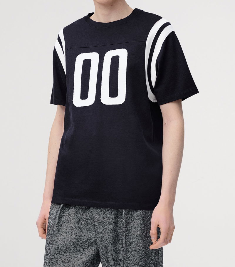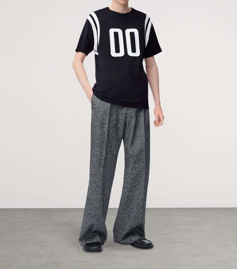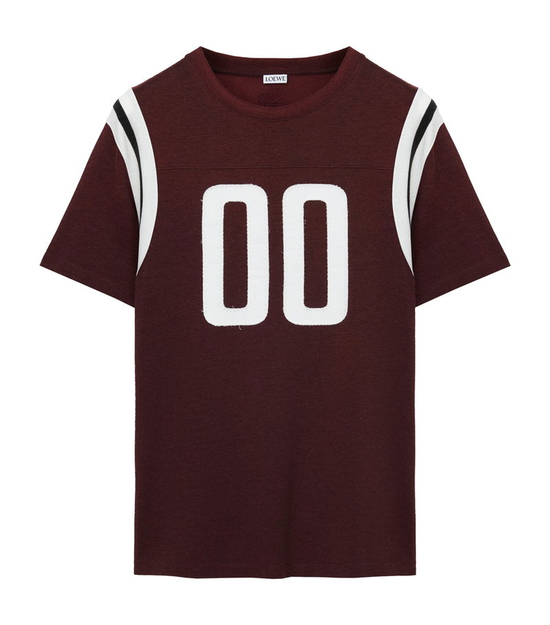 Loewe's Spring/Summer 2025 collection leans into the brand's collegiate references, bringing varsity staples into its playful universe. Here, for example, the brand offers a subversive take on the classic American football jersey, complete with a panelled construction, '00' patch and striped shoulders.