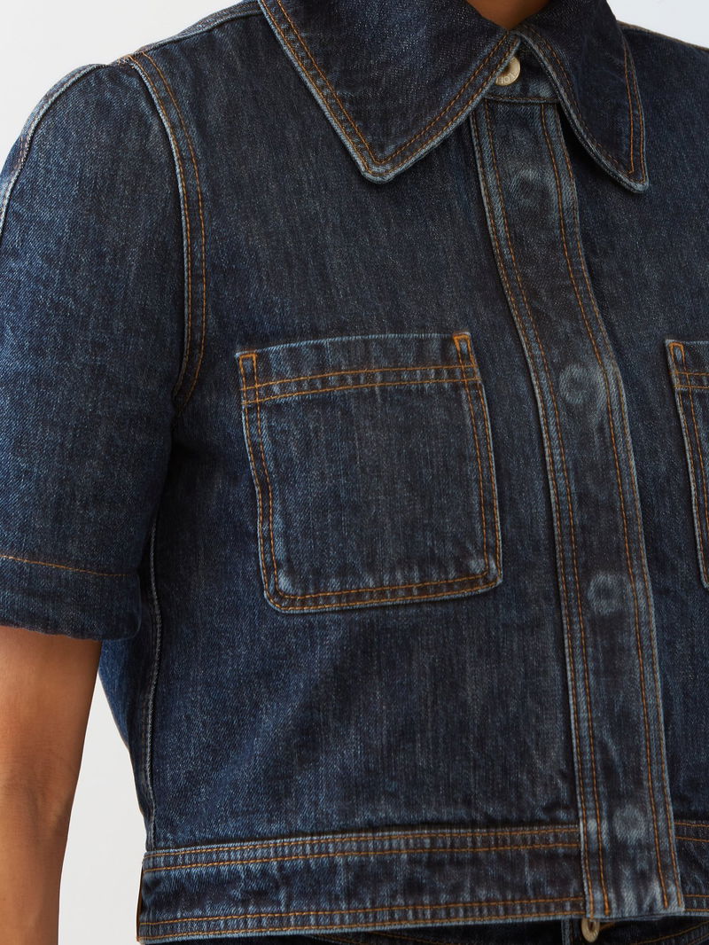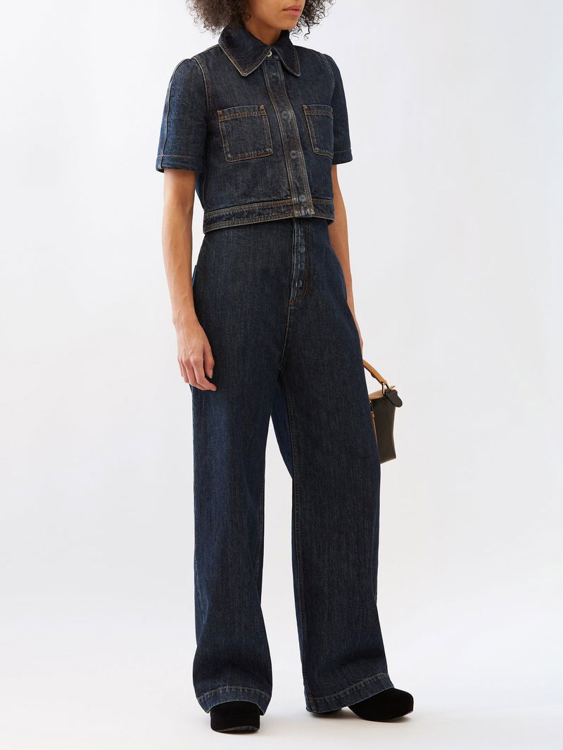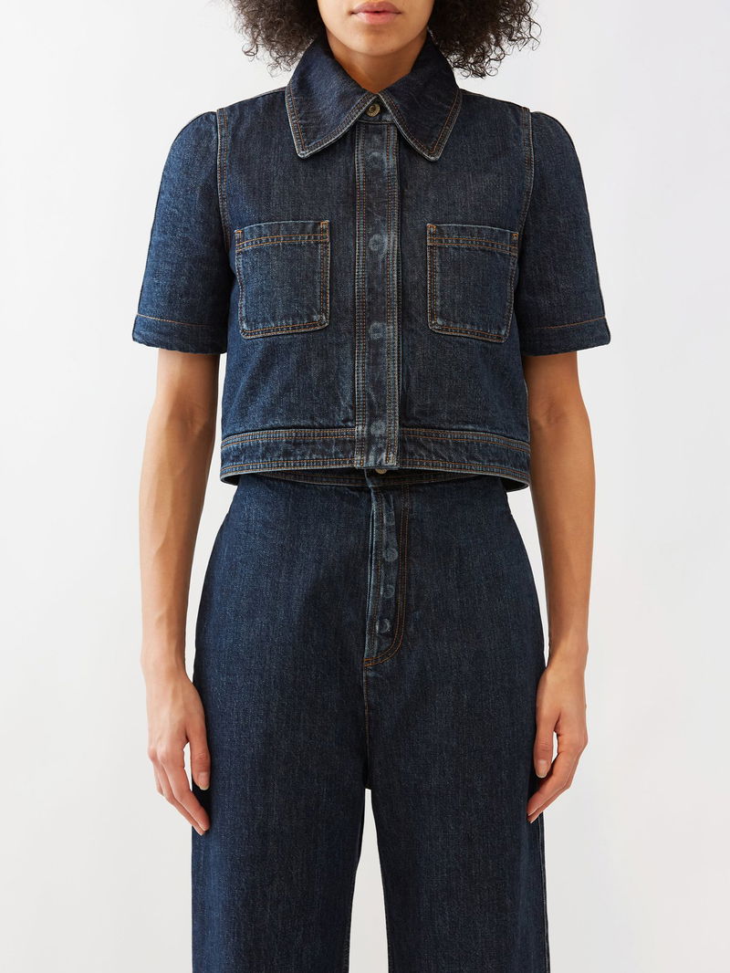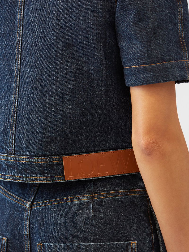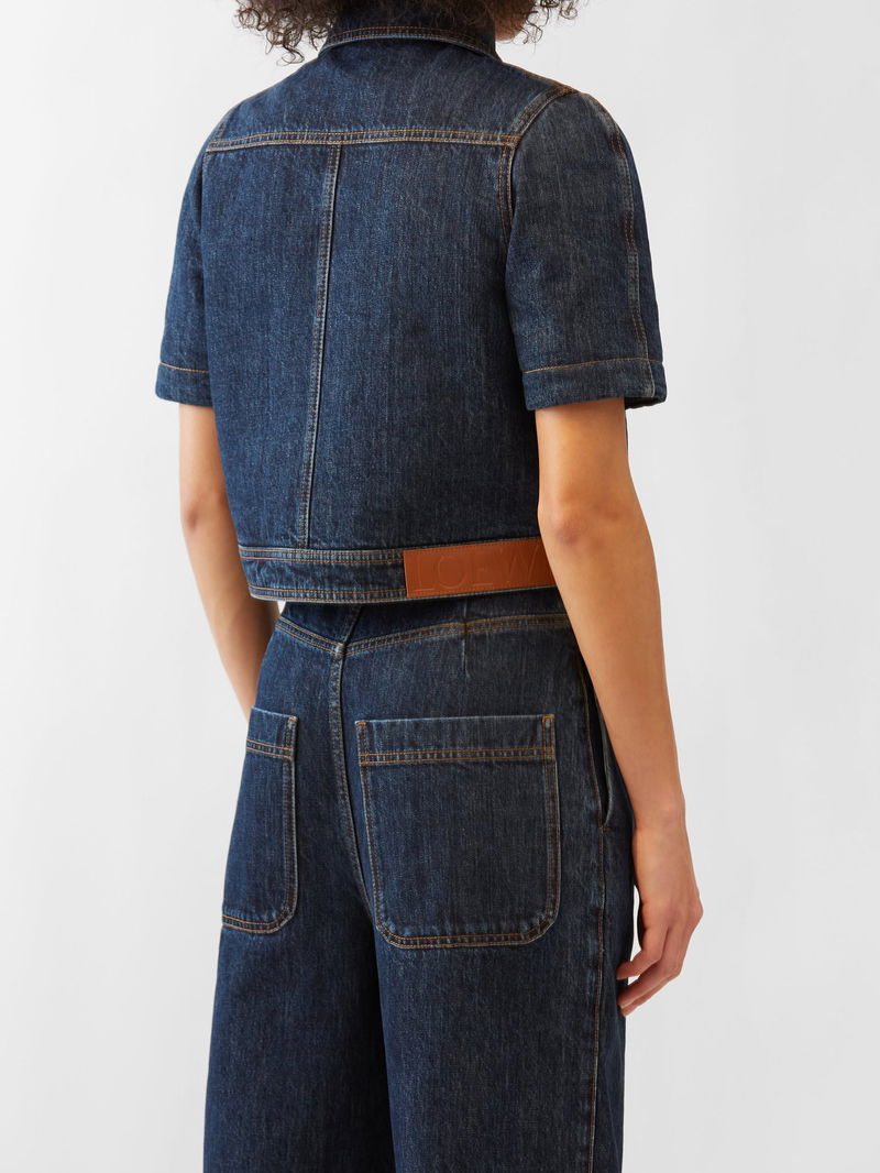 LOEWE refreshes workwear codes in this blue jacket, cut from washed denim to a cropped hem and finished with a leather logo patch.