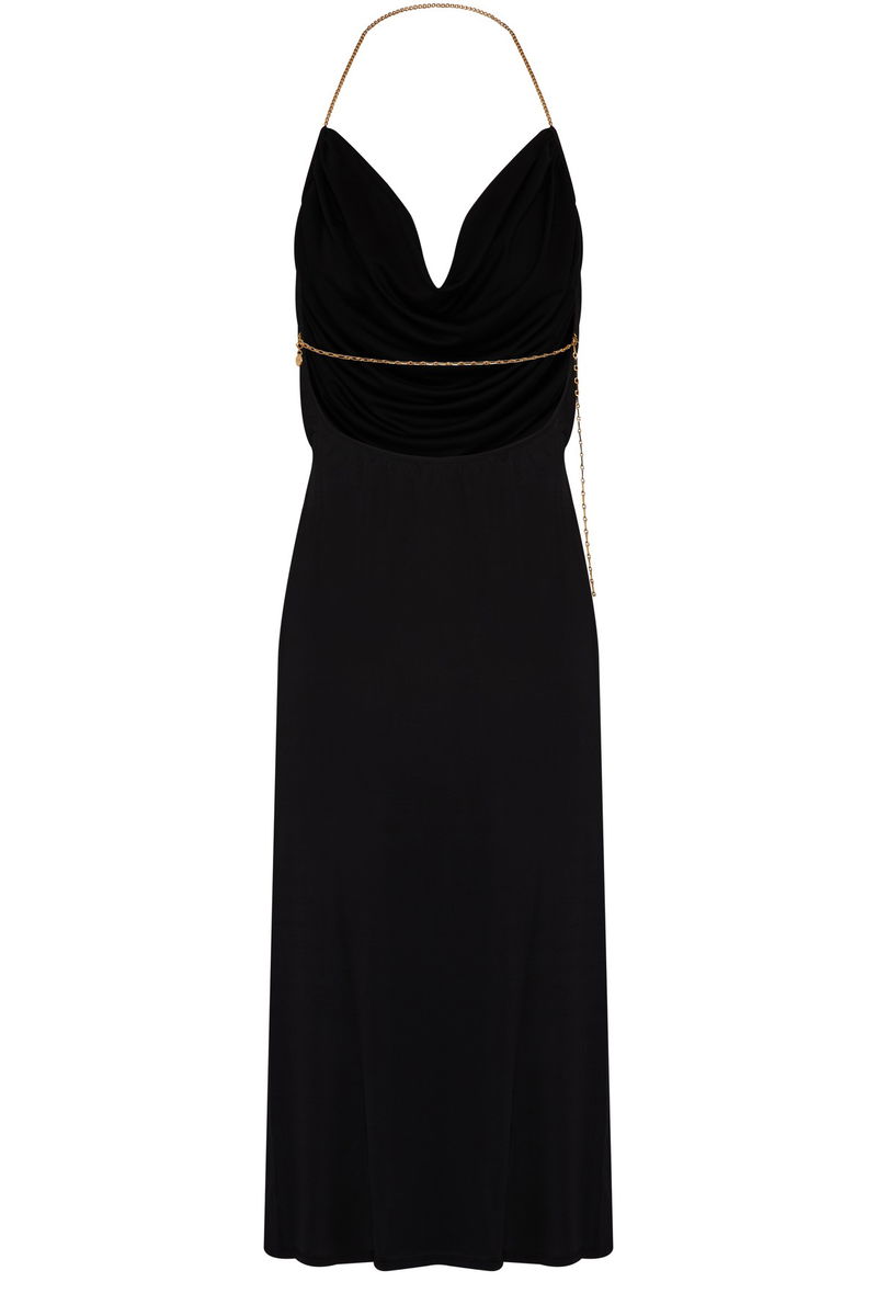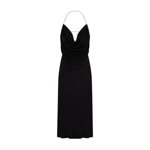 The Loewe Draped Dress is a stunning midi dress that exudes elegance and sophistication. With its sleeveless design and delicate shoulder straps, it showcases a feminine silhouette. The dress features an alluring open back and intricate draped detailing, adding a touch of allure. The gold finishes add a luxurious touch to this timeless piece.